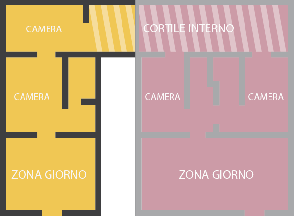 Le strutture a volta dividono l’appartamento in tre parti: il soggiorno-cucina, una camera da letto matrimoniale e il bagno, e un’altra camera che si affaccia sul cortile privato. Volta ha un ingresso indipendente.
