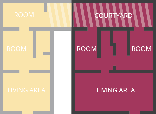 The Pietra apartment is the bigger of the two: it has two bathrooms (one of them has a tub), the kitchen extends to the living room, there’s a master bedroom and a double room facing on a private courtyard. Pietra has an independent entrance and overlooks the common garden.